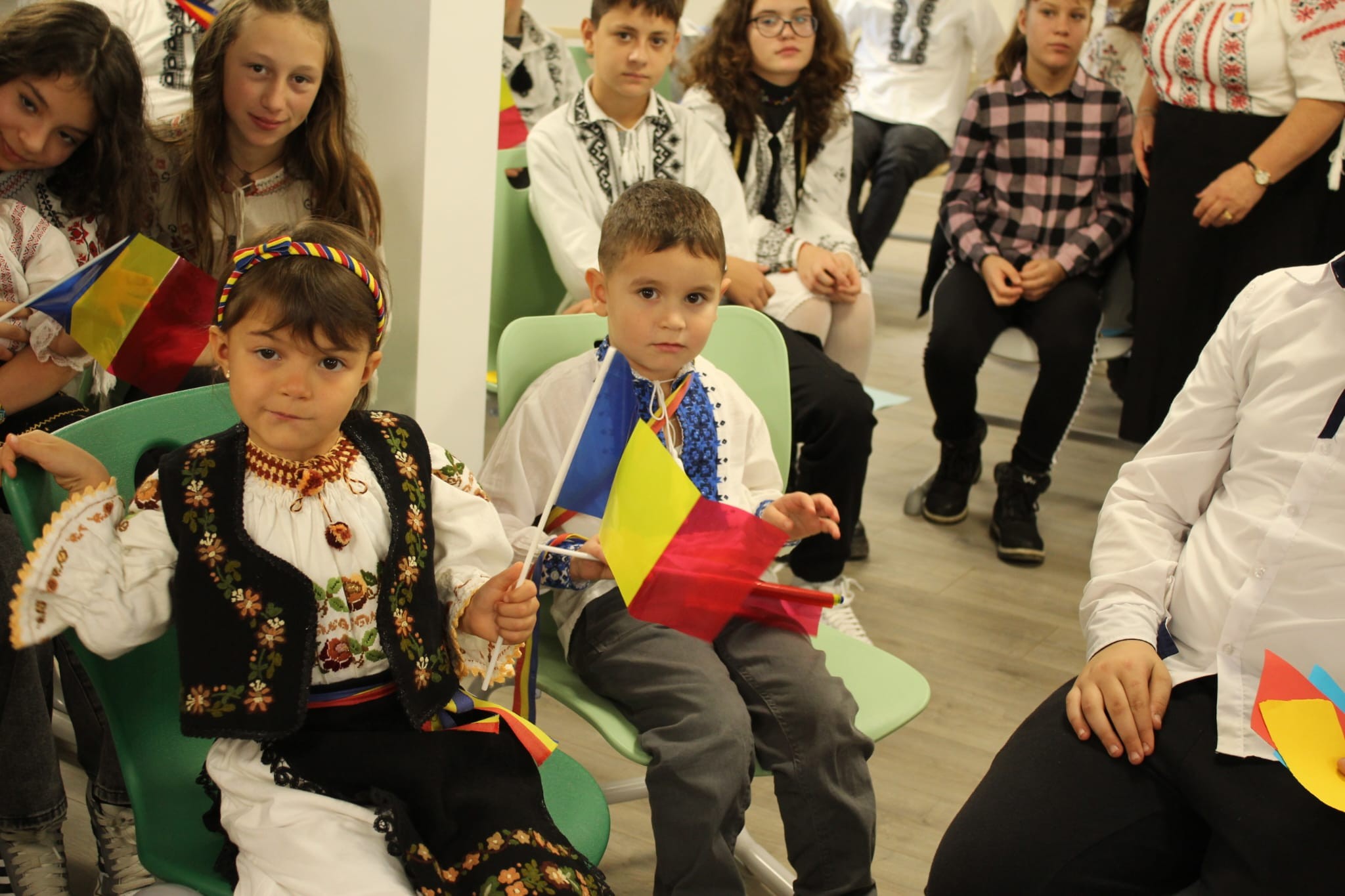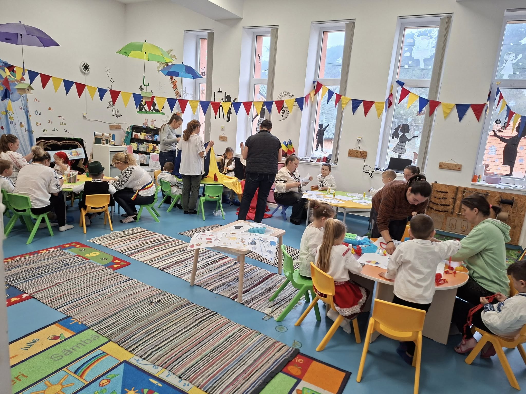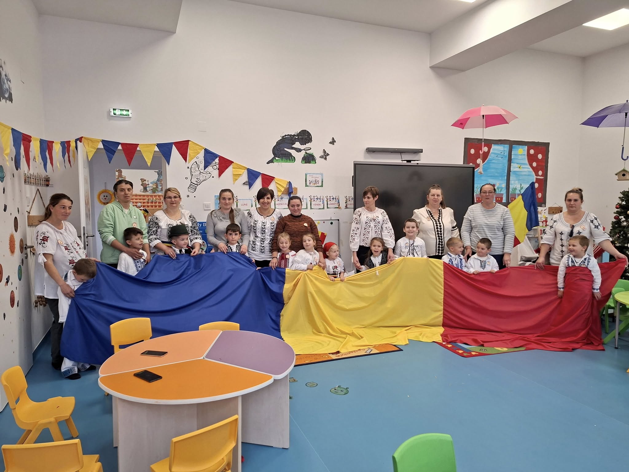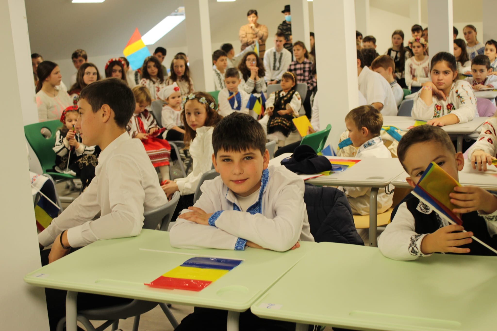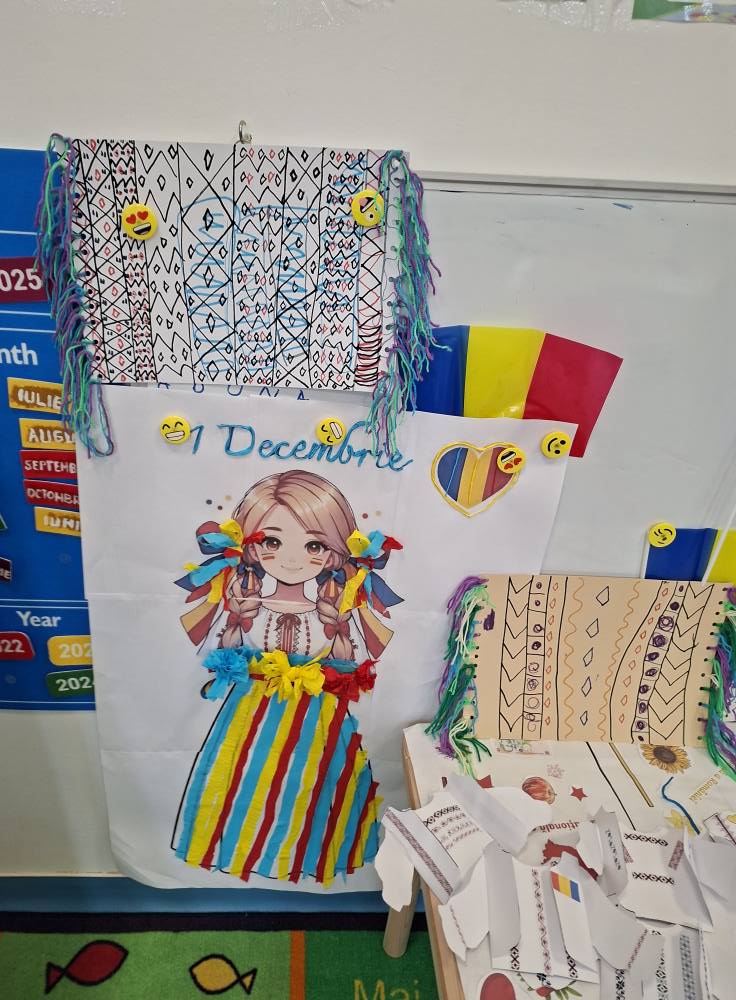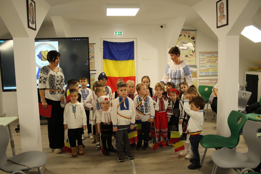 Împreună au cusut un drapel uriaș din material textil, au participat la concursuri vesele, au decupat, lipit și creat cu bucurie, iar la final au dansat Hora Unirii, purtând mândri culorile tricolorului.