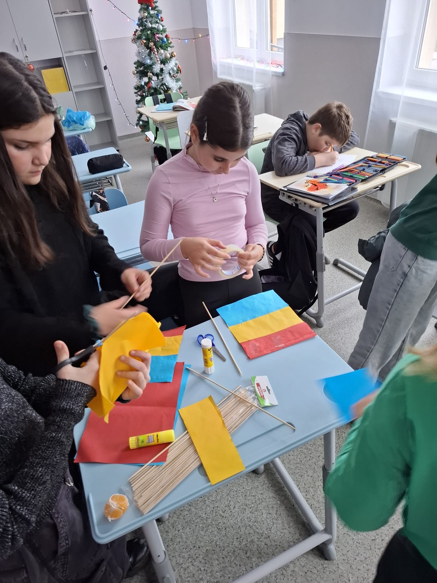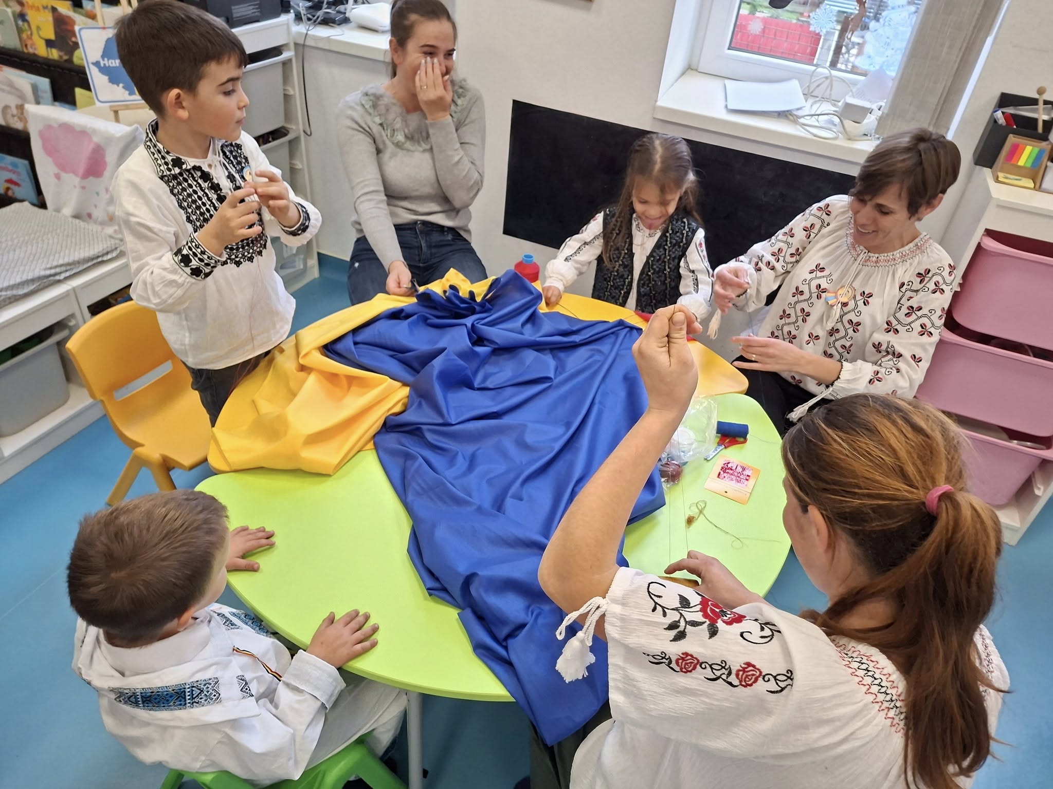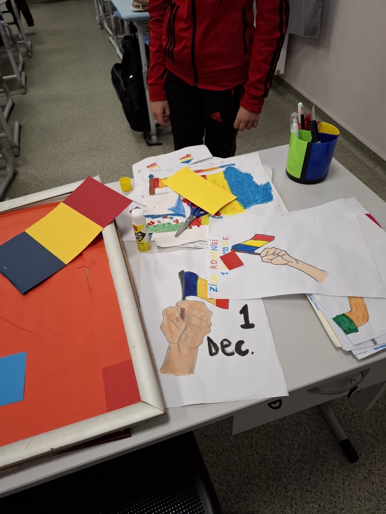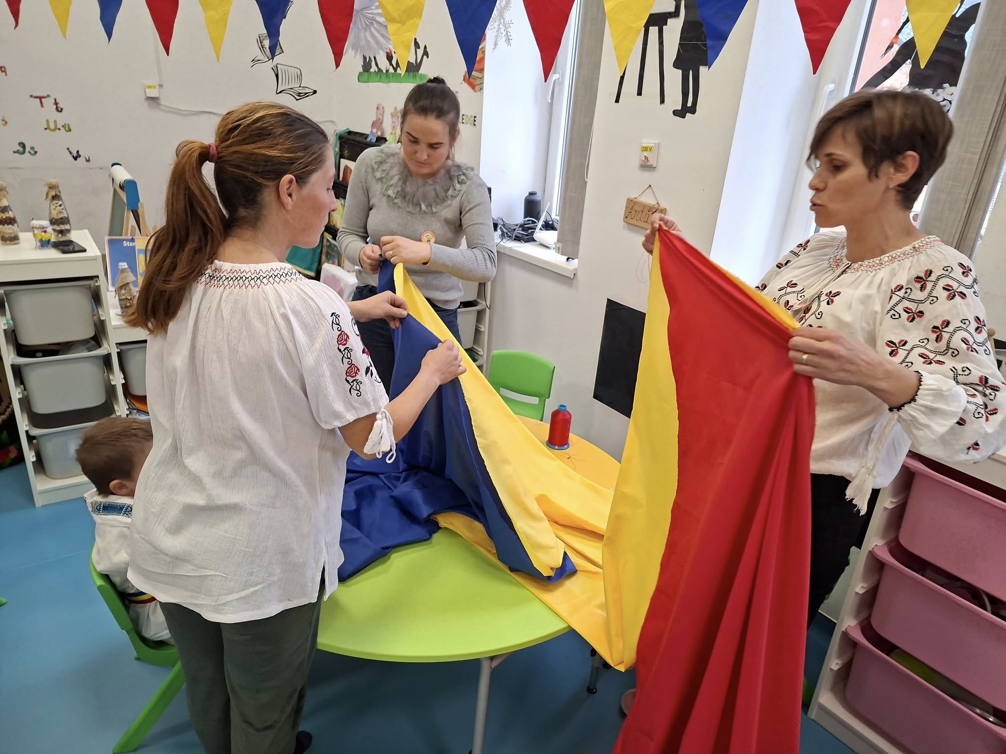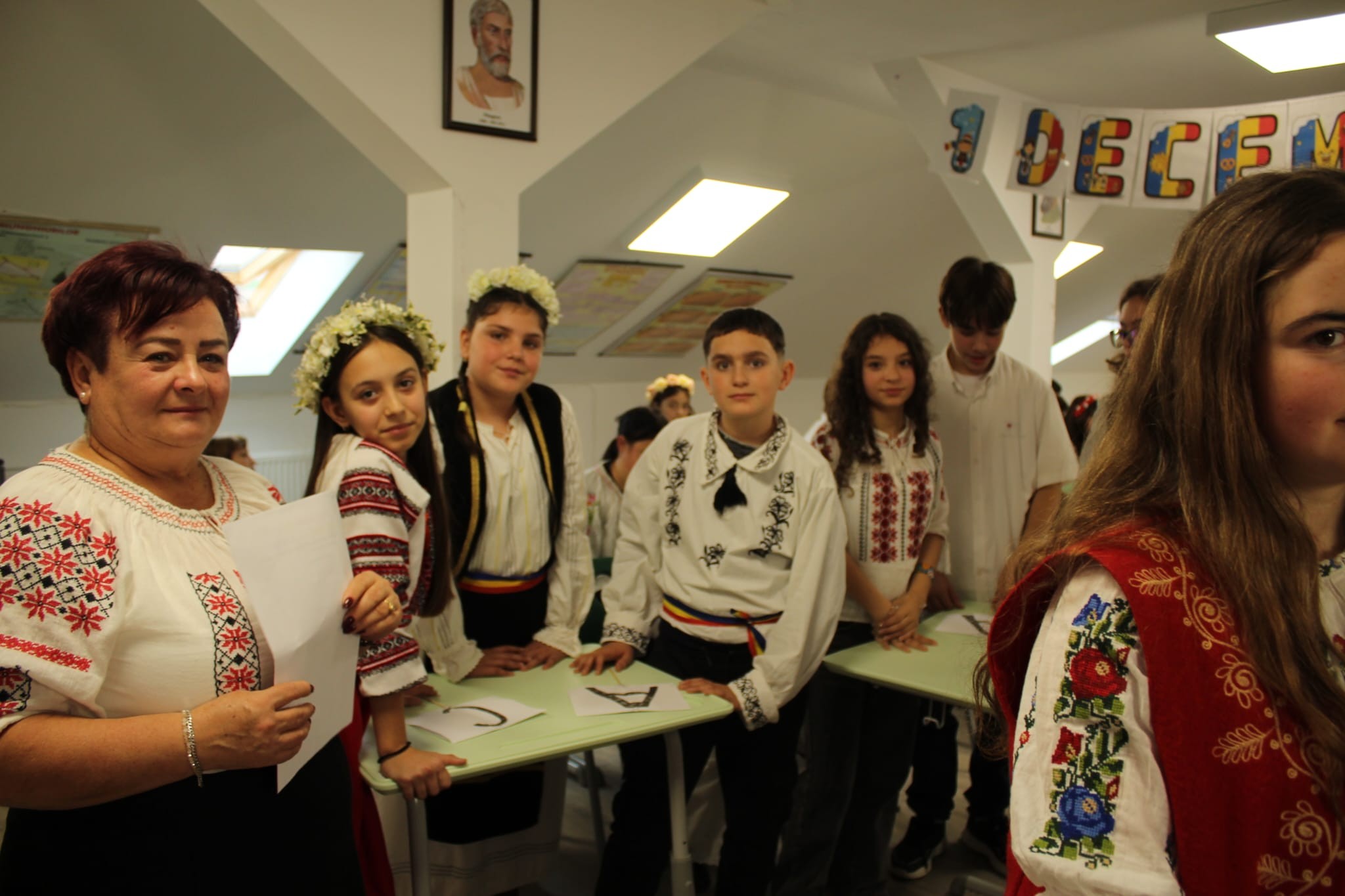 Împreună au cusut un drapel uriaș din material textil, au participat la concursuri vesele, au decupat, lipit și creat cu bucurie, iar la final au dansat Hora Unirii, purtând mândri culorile tricolorului.