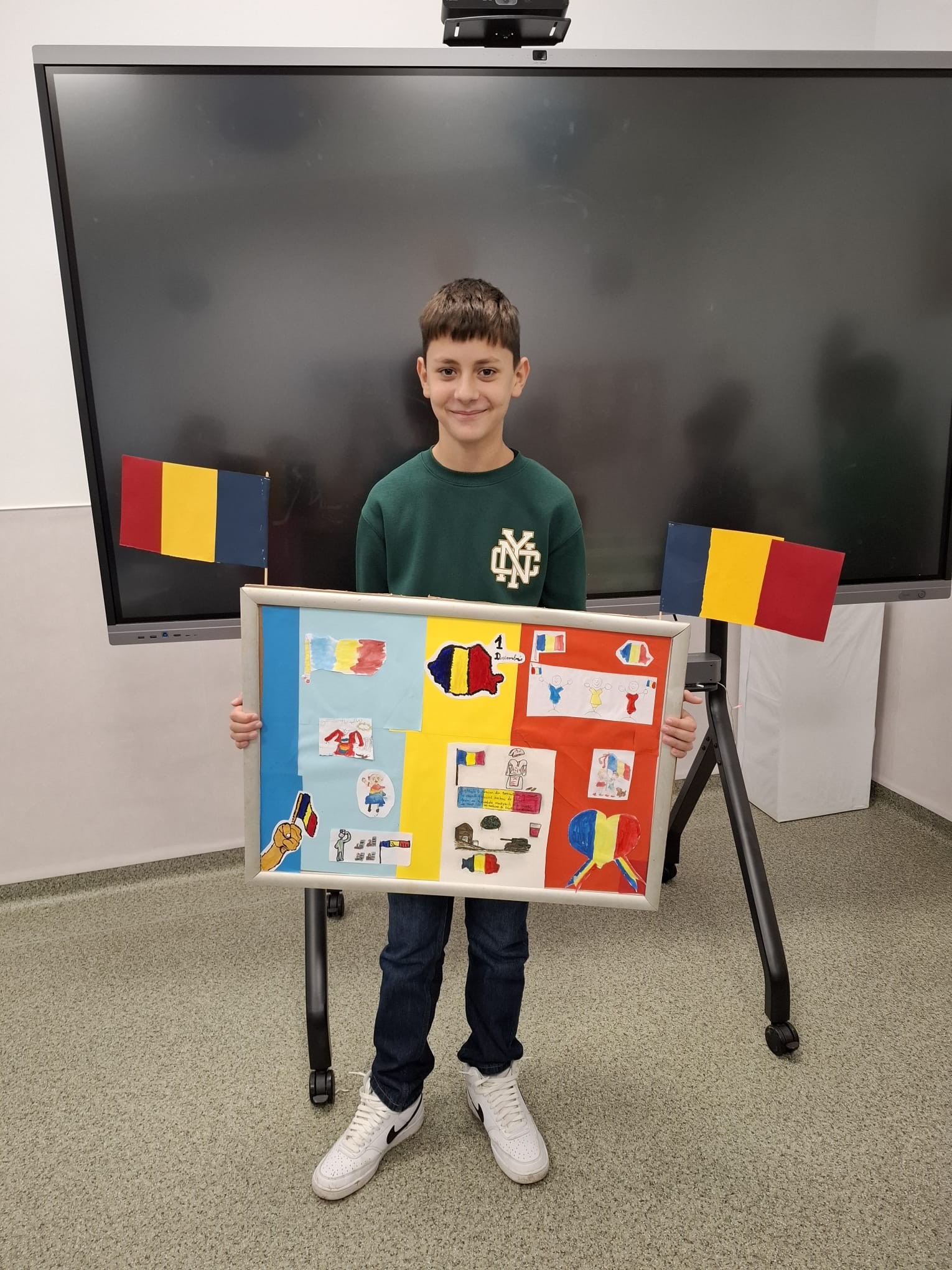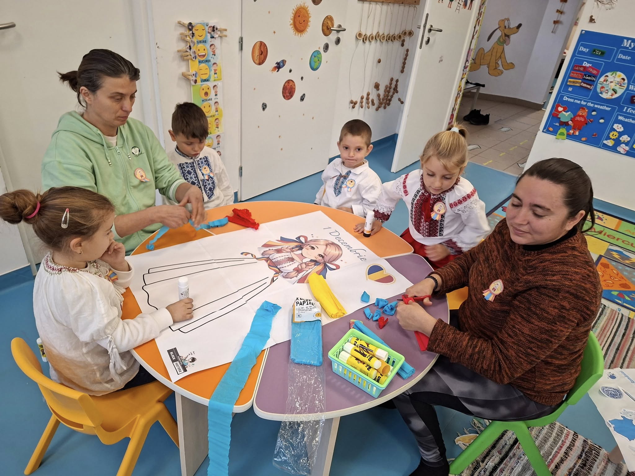 Împreună au cusut un drapel uriaș din material textil, au participat la concursuri vesele, au decupat, lipit și creat cu bucurie, iar la final au dansat Hora Unirii, purtând mândri culorile tricolorului.